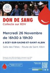 La prochaine collecte de sang de l’amicale des donneurs de sang bénévoles de Scey/Saône aura lieu le mercredi 26 novembre prochain de 16h30 à 19h30, salle des fêtes de Scey sur Saône.
